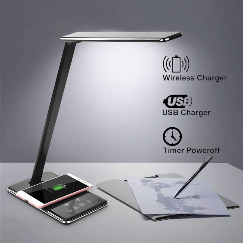The image features a modern desk lamp equipped with multiple convenient features, including a wireless charger for phones, a USB charging port, and a timer for automatic power-off. The lamp's sleek design makes it a functional and stylish addition to any workspace.