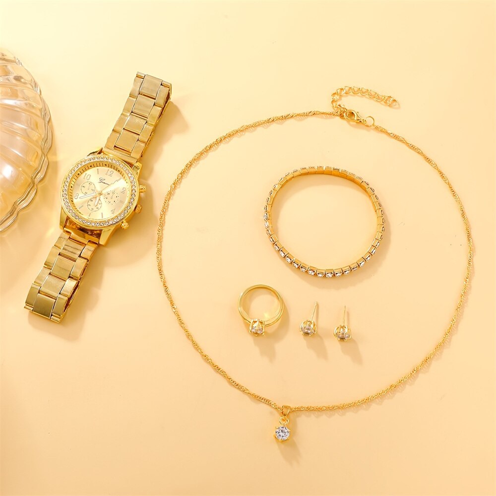Indulge in opulence with this 6PCS Set of Luxury Women's Watch, Ring, Necklace, and Earring ensemble. This collection combines exquisite timepieces with coordinating jewelry pieces, creating a complete and sophisticated look. Elevate your style with this set that exudes luxury and timeless elegance, making it the perfect accessory for special occasions and everyday glamour.