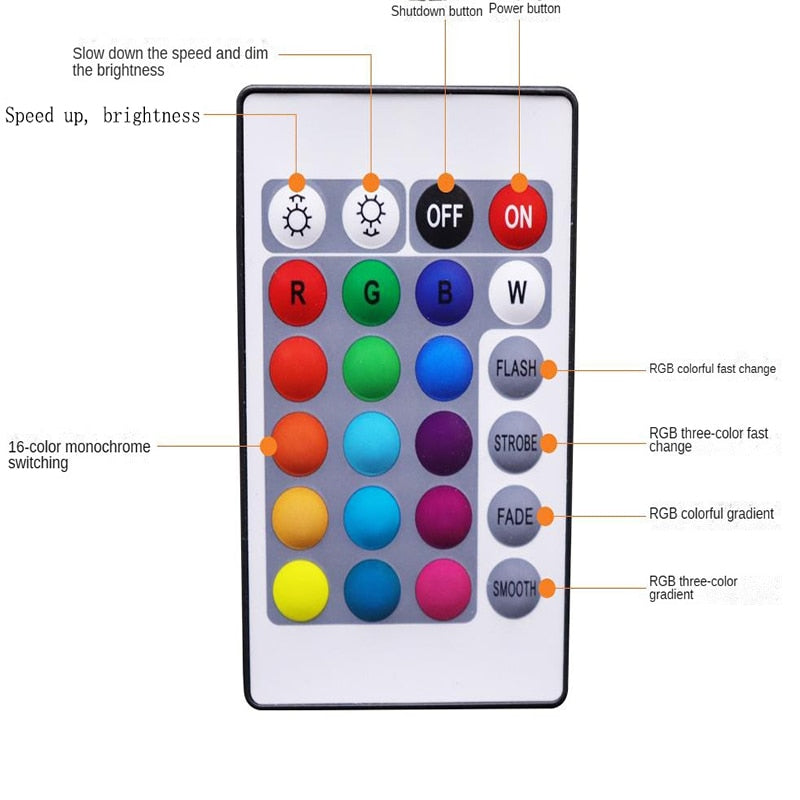 Remoter Control Mode: Remote Control with On/Off, 16 colors, adjustable brightness, flash mode, smooth mode.