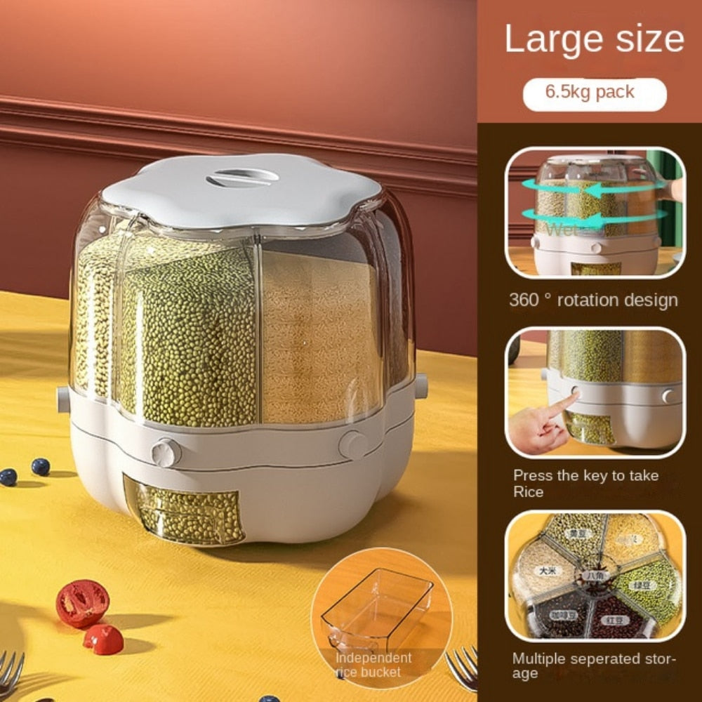 The Cereal Storage Box has strong sealing and can prevent moisture and dust. 6-Grid Rotating Grain Dispenser has a simple and elegant appearance. The key design is convenient to control and store whole grains such as rice, oat, mung bean, candy, and dry food.