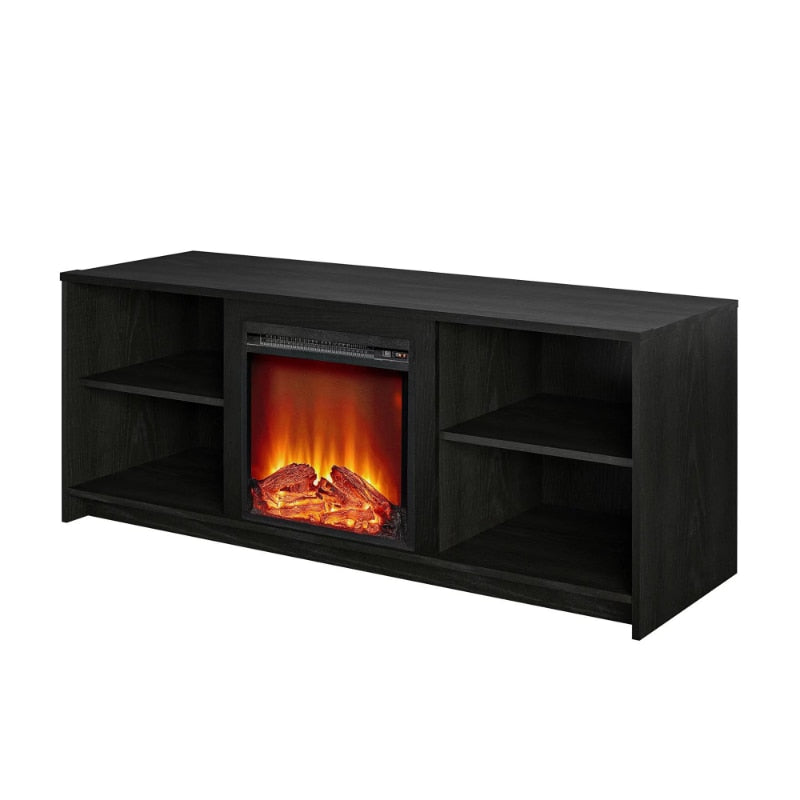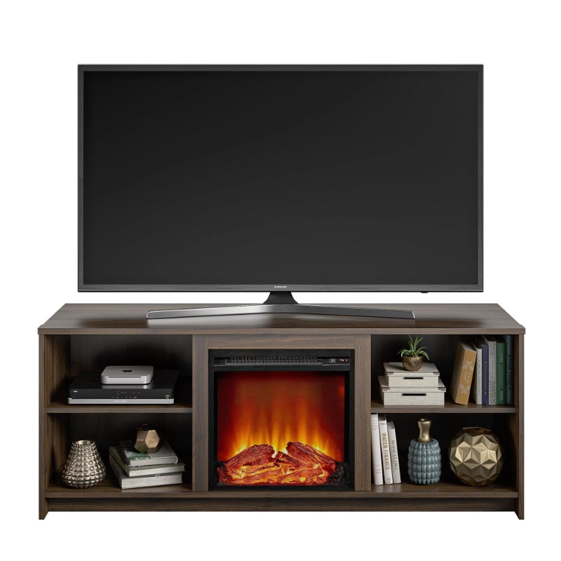 Get the warm and relaxing ambiance of a crackling fireplace without all of the maintenance with the Mainstays Fireplace TV Stand. This TV Stand can accommodate most TVs up to 65â wide or up to 120 lbs. The classic walnut woodgrain finish on the laminated MDF and particleboard will coordinate seamlessly with your existing décor. The 18â electric fireplace insert can heat a room up to 400 sq. ft. and plugs into a standard 120V outlet. The flame effect can be used with or without the heat so you can enjoy the fireplace all year long. On each side of the fireplace insert are 2 shelves, 1 adjustable so you can organize your DVD or Blu-Ray player, cable box, DVDs, and video games. The wire management makes it easy to plug in your devices and keeps cords tangle free. The TV Stand ships flat to your door and requires assembly upon opening. Two adults are recommended to assemble. Once assembled, the TV Stand measures to be 23.43âH x 59.69âW x 19.69âD.
