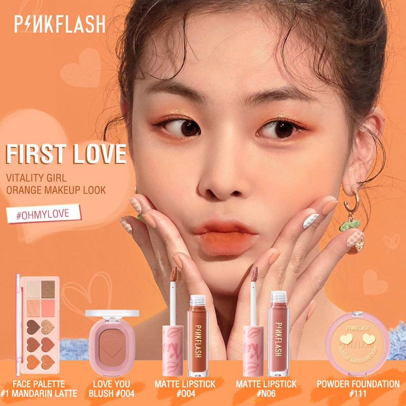 ''First Love'' Makeup set - Vitality girl orange makeup look, including facial palette #1; Blush # O04; Matte Lipstick #O04, N06; Matte powder foundation ( can choose any color).