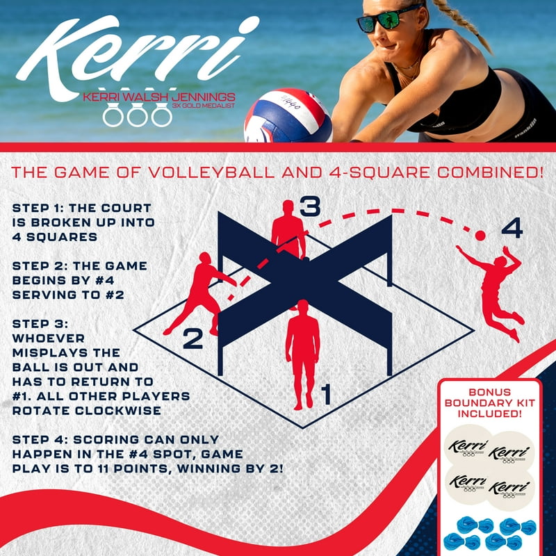 Quad Volleyball-Kerri Walsh Jennings Edition from is a new twist on a classic backyard volleyball game. The concept combines the concept of volleyball and 4-square and is fast paced and entertaining for all age levels. Start with 4 players or more and take turns rallying each point. In this exciting game, if you miss a hit, pass or serve you are out and then everyone will rotate clockwise. Points are only scored when serving and each player is responsible for his 11.5 x 11.5 foot square. Gameplay is to 11 points, winning by 2! The set includes (5) poles, a quad shaped net, 1 traditional volleyball and 1 jumbo 16in volleyball. In addition, all guide ropes, stakes and court boundary marking kits are included. Take your volleyball to the next level with this exciting new game-don`t forget to pack it for your next party, picnic or BBQ!
