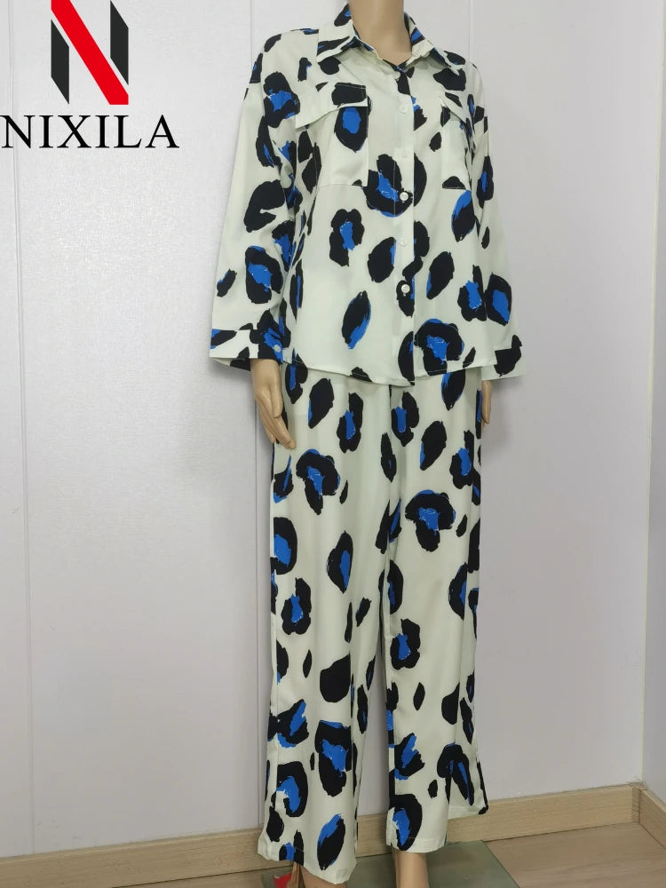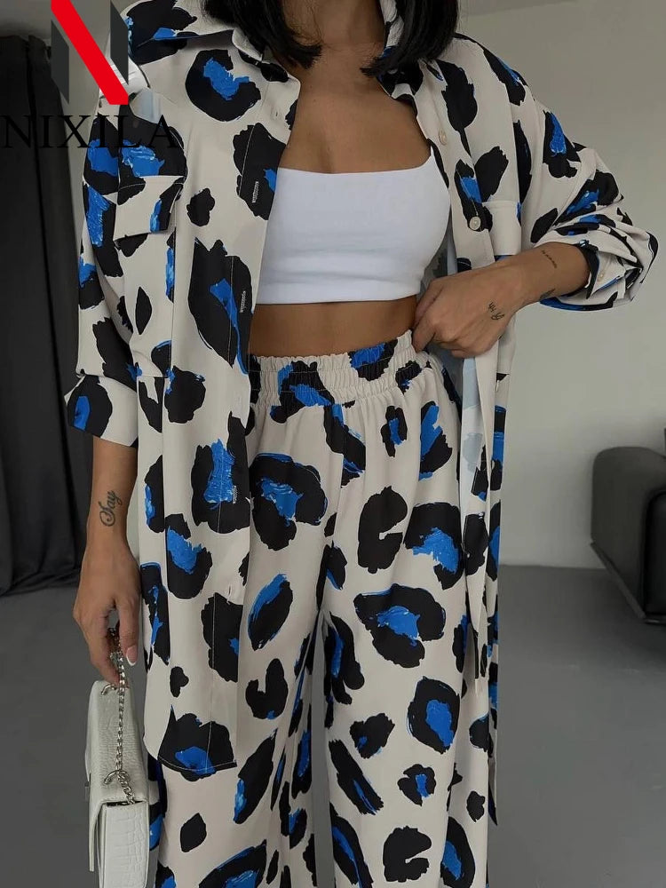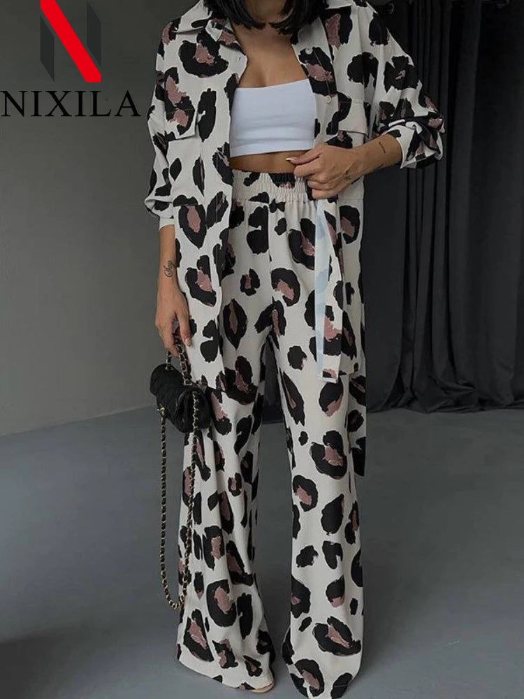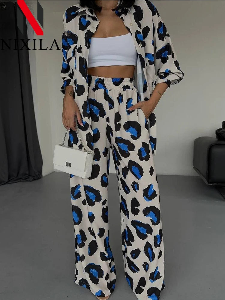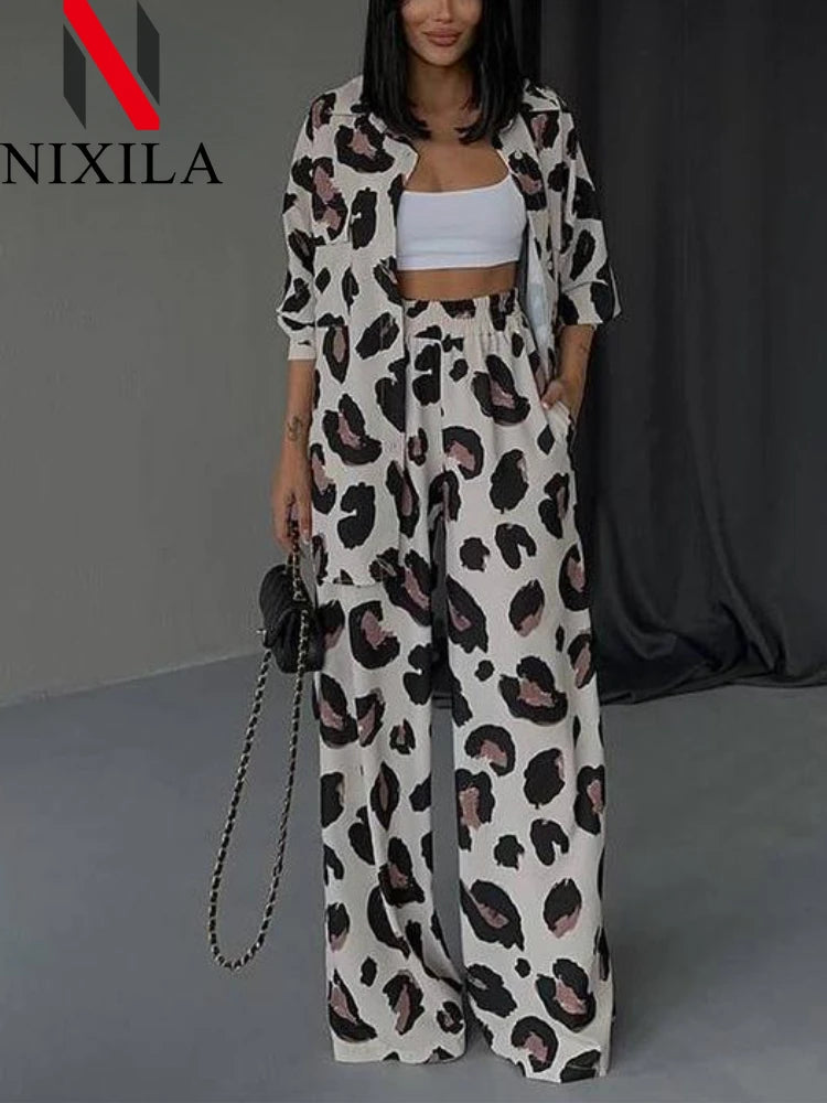 Womens Outifits Leopard Printed Elegant Women's Sets Casual Streetwear Long Sleeve Tops Wide Leg Pants Tracksuit Two Piece Sets